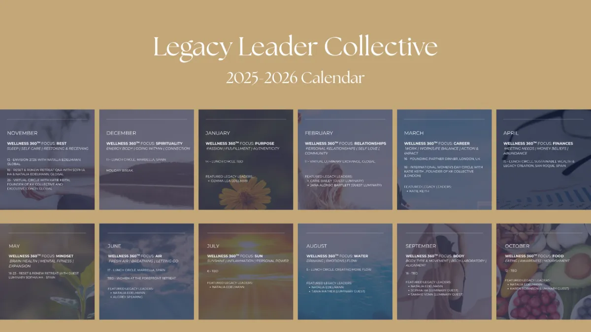 The Legacy Leader Collective is a private network of global circles for women redefining success through wellness, wealth, and leadership. It’s more than a membership, it’s a place of connection, belonging, and elegant growth, built on the Wellness 360™ framework and powered by LUXE Club Retreats and our Preferred Partners.
