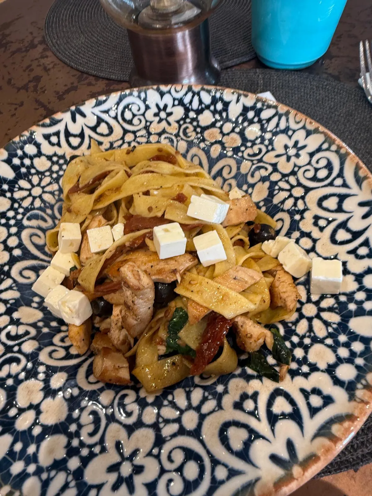 Mediterranean Tagatellle with sun-dried tomatoes, chicken, black olives, and feta